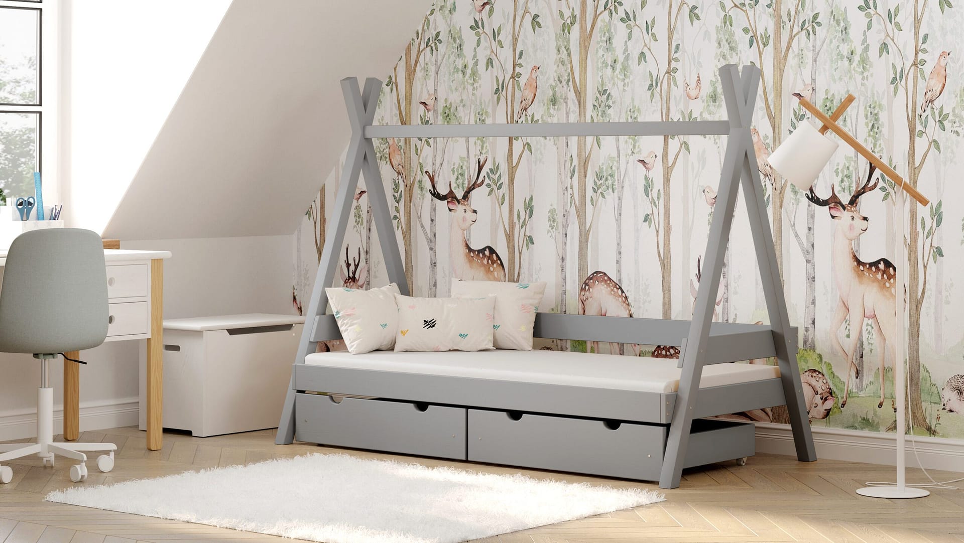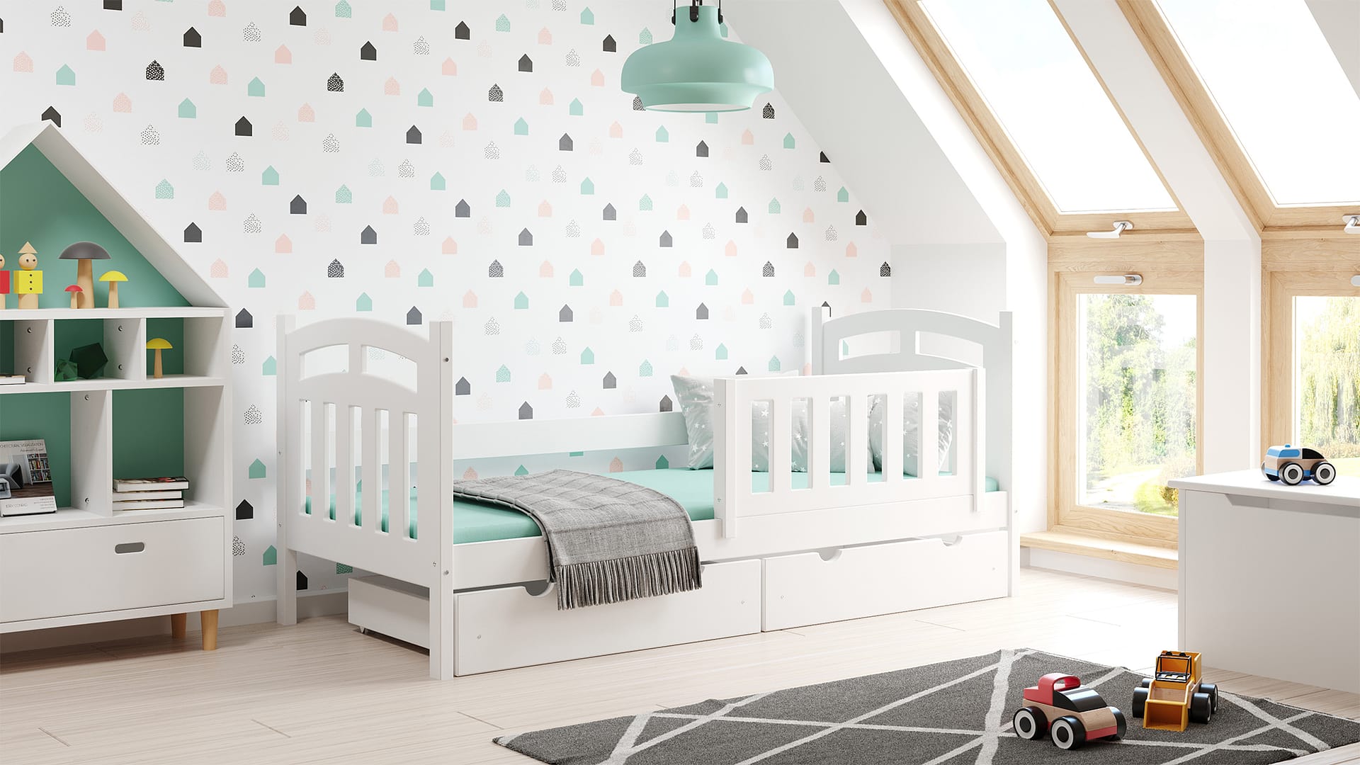 Warto zwrócić uwagę na to, że drewniane łóżka od Meble Wróbel nie wyglądają standardowo. Są wykończone w ciekawy sposób dzięki takim dodatkom, jak belki w kształcie tipi czy wezgłowia z wyciętymi wzorami. Moją uwagę przykuły również łóżka – domki. Są dostępne w różnych kolorach, by móc je bez problemu dopasować do stylu dziecięcego pokoiku. Możesz wybrać też opcję z materacem lub bez, dobrać barierki i szuflady. Bo to właśnie ty najlepiej wiesz, czego potrzebuje twój maluch.